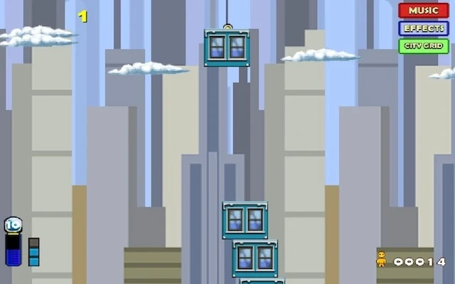 Construye rascacielos lo más altos posible apilando bloques de la manera más precisa para evitar que se caiga. Cada vez que apiles un bloque llegarán en paracaidas los nuevos inquilinos a ocupar su respectivo piso (Bloque). Debes poner a prueba tu poder de observación para dar el clic en el momento oportuno para soltar el bloque y ser muy precisos.