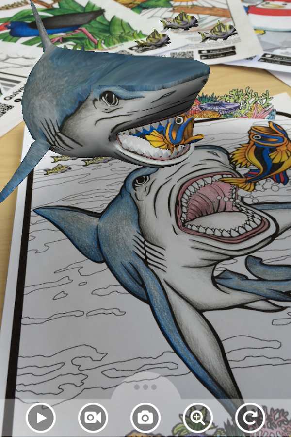 INSTRUCCIONES: Descarga e imprime las plantillas de dibujo de la web del autor marcadas como FREE y colorealas. Instala la app en smartphone y presiona en el circulo con la mariposa, luego apunta la cámara sobre la plantilla coloreada como si le fueras a tomar una fotografía, cuando te muestre un rectángulo azul espera unos segundos y aparecerá en 3D y animada el dibujo coloreado respetando los colores que aplicaste.